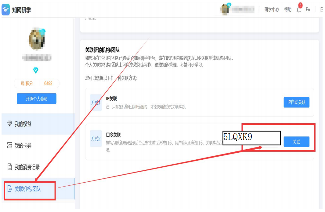第五步:选择“关联机构/团队”,选择“口令关联”输入 口令:5LQXK9